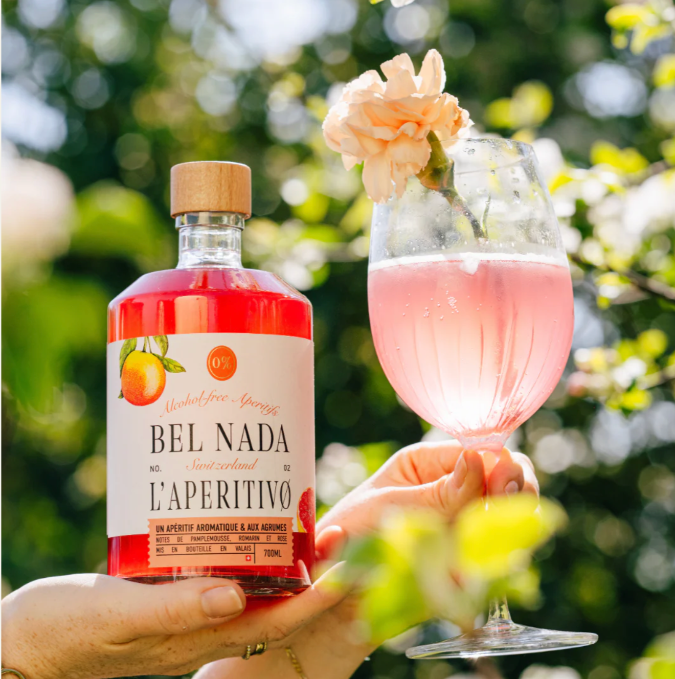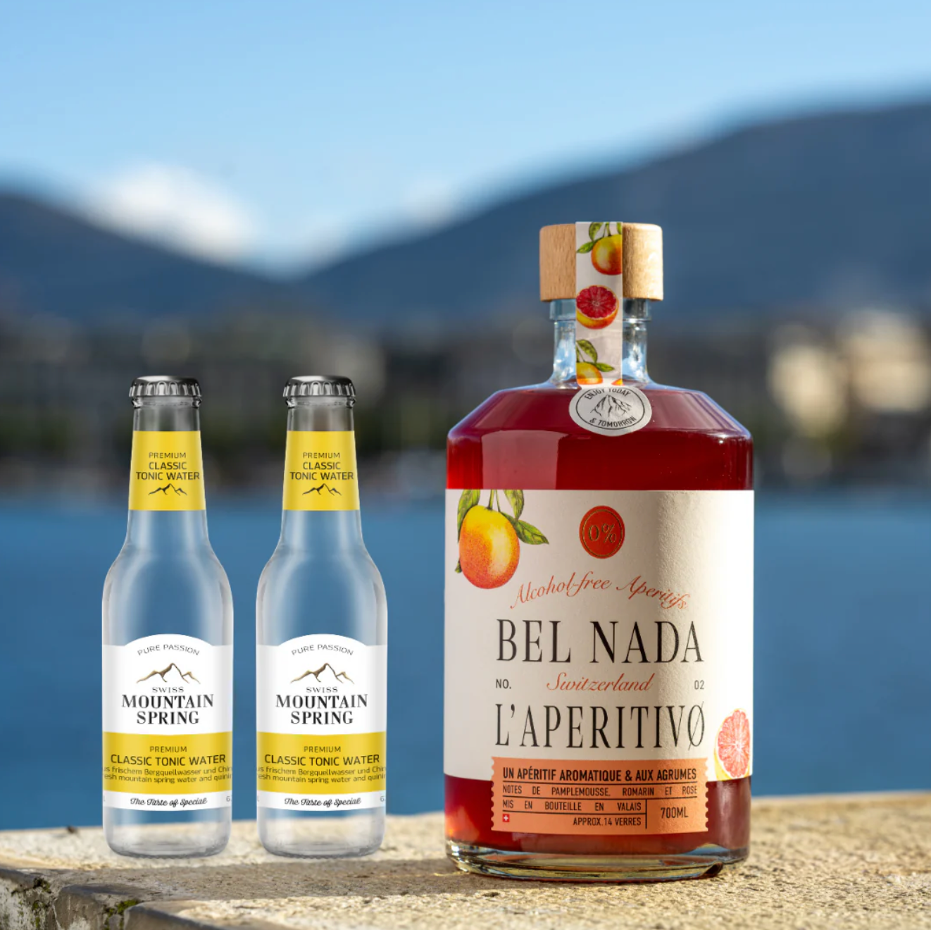 This set includes one bottle of Bel Nada non-alcoholic Aperitivo with two bottles of Swiss Mountain tonic water, providing a perfect combination for any occasion.