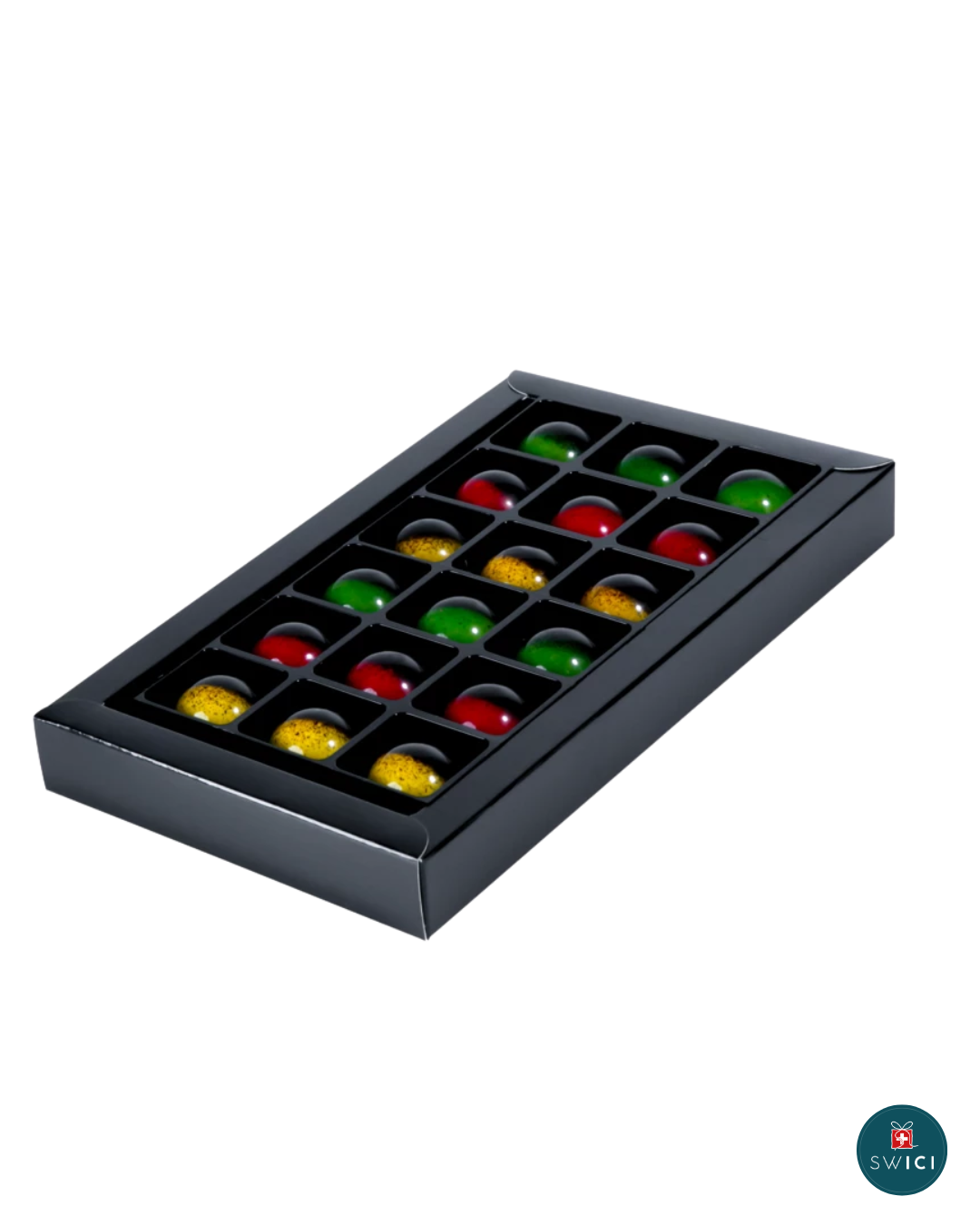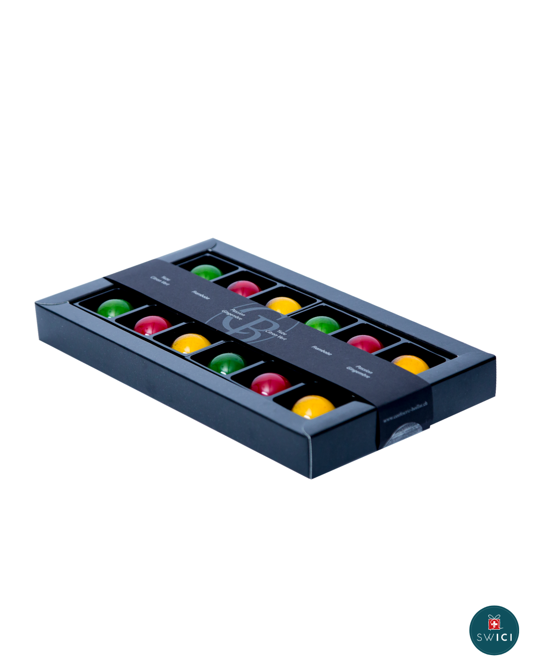 Ingrédients : Sucre, beurre de cacao, pâte de cacao, fruit de la passion, yuzu, framboise, citron vert, mangue, poudre de lait entier, lait écrémé en poudre, lécithine de soja, jus de gingembre, alcool de framboise, vinaigre de framboise, colorant (E124, E102, E142, E172)
