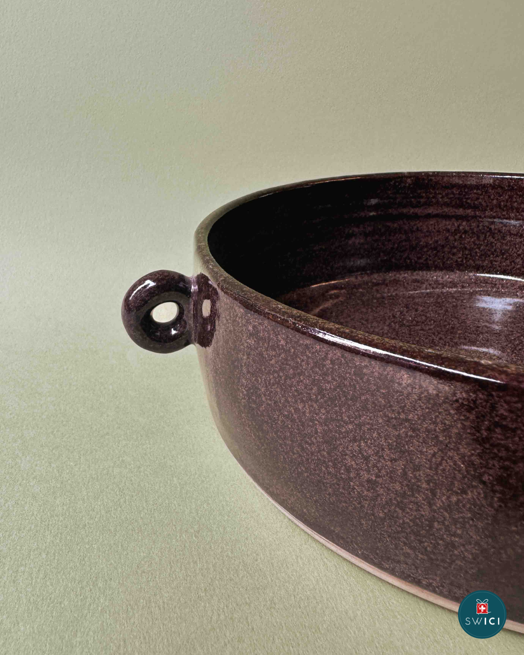 Ce plat de présentation brun moucheté a été entièrement réalisé à la main au tour de potier. C’est une pièce unique pour partager des beaux moments autour de votre table.
